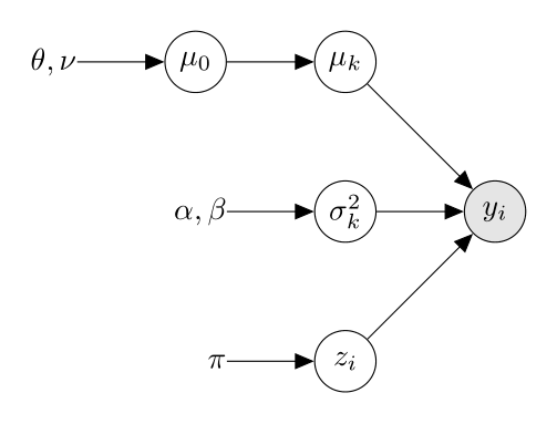 The model we are interested in is $$ \begin{align*} & \mu_0 \sim \mathcal{N}(\theta, \nu) \\ & \mu_k | \mu_0 \sim \mathcal{N}(\mu_0, \tau^2), \quad \text{$\tau^2$ known} \\ & \sigma^2_k \sim \text{InvGamma}(\alpha, \beta) \quad \text{$\alpha$, $\beta$ known} \\ & z_i \sim \text{Categorical}(\pi) \\ & y_i | z_i = k, \mu_k, \sigma_k^2 \sim \mathcal{N}(\mu_k, \sigma^2_k) \end{align*} $$ Note that we use the term hierarchical as we added a hyperprior $\mu_0$, which the means of the components $\mu_k$ depend on. We can represent the model graphically as: